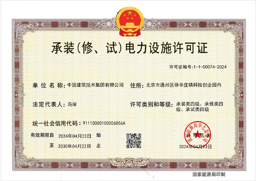 4月23日,經(jīng)北京市住房和城鄉(xiāng)建設(shè)委員會(huì)、國(guó)家能源局華北監(jiān)管局核準(zhǔn),中國(guó)建技申報(bào)的電力工程施工總承包貳級(jí)、環(huán)保工程專(zhuān)業(yè)承包貳級(jí)、承裝(修、試)電力設(shè)施許可證(四級(jí))三項(xiàng)資質(zhì)成功獲批。