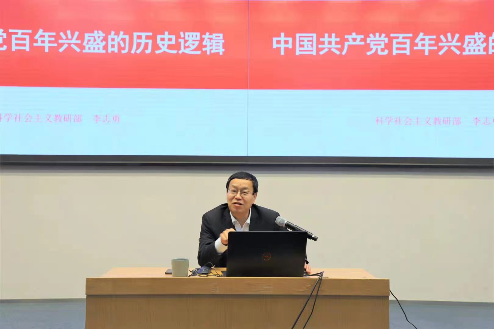 李志勇教授從初心使命、光輝歷程、偉大成就和歷史經驗四個方面引導大家一同回顧了中國共產黨成立以來的崢嶸歲月。在對歷史經驗的講授中,李教授分別從思想一變天地寬、勇立潮頭敢為先、得民心者得天下、自我革命御風險、紅色基因不能變和團結統(tǒng)一鑄輝煌六個方面,闡明了中國共產黨能夠帶領中國人民從站起來、富起來到強起來的深刻原因,充分論證了中國特色社會主義制度的優(yōu)越性和道路的必然性。