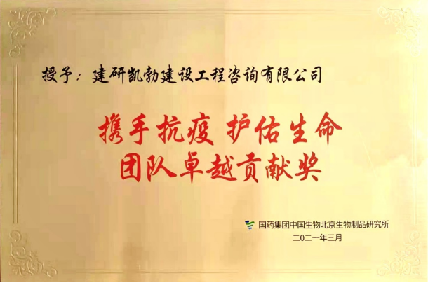 3月27日,集團(tuán)公司下屬子公司建研凱勃建設(shè)工程咨詢有限公司(以下簡稱“建研凱勃”)榮獲國藥集團(tuán)中國生物北京生物制品研究所頒發(fā)的“攜手抗疫護(hù)佑生命”團(tuán)隊卓越貢獻(xiàn)獎。
