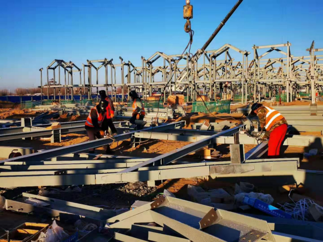 為確保工期,天津鋼結(jié)構(gòu)分公司負責人張衍雷以身作則,下基層,駐現(xiàn)場,第一時間解決遇到的困難和問題,確保重要工序24小時不停產(chǎn),為現(xiàn)場施工的有序進行提供了良好保障。在氣溫零下26度的施工現(xiàn)場,施工管理人員和安裝作業(yè)人員40余人冒著凜冽寒風,克服冬季白晝時間短、冰天雪地安裝難以施展等諸多困難,穩(wěn)步推進工程進度,充分展現(xiàn)了鋼構(gòu)鐵軍能打硬仗、吃苦耐勞的良好精神風貌。?