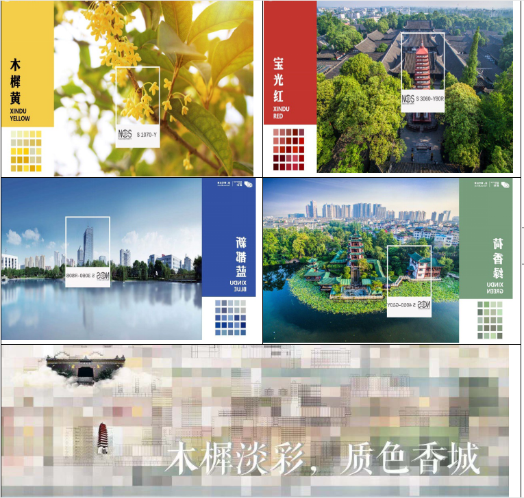 項目團隊運用色彩學(xué)的調(diào)研分析方法,通過溯文脈、理現(xiàn)狀、推主色、定旋律、落應(yīng)用對新都進行梳理,通過尋找能夠體現(xiàn)新都區(qū)歷史文化傳統(tǒng)和自然色彩基因的城市色彩特征,尋找匹配新都區(qū)光環(huán)境、自然環(huán)境、人文環(huán)境及傳統(tǒng)建筑的城市色彩特征,最終選定以成都天府黃色系為延續(xù),來源于新都明朝狀元楊升庵“寶書林中碧玉涼·秋風(fēng)又送木樨黃”詩句中的“木樨黃”作為新都區(qū)城市色彩特征色主色,以新都?xì)v史建筑的“寶光紅”,新都城市發(fā)展的“新都藍”,桂湖森林基底的“荷香綠”為特征色色系,并根據(jù)新都的人文歷史、地理特征、城市發(fā)展確定城市色彩基調(diào)“木樨淡彩,質(zhì)色香城”。