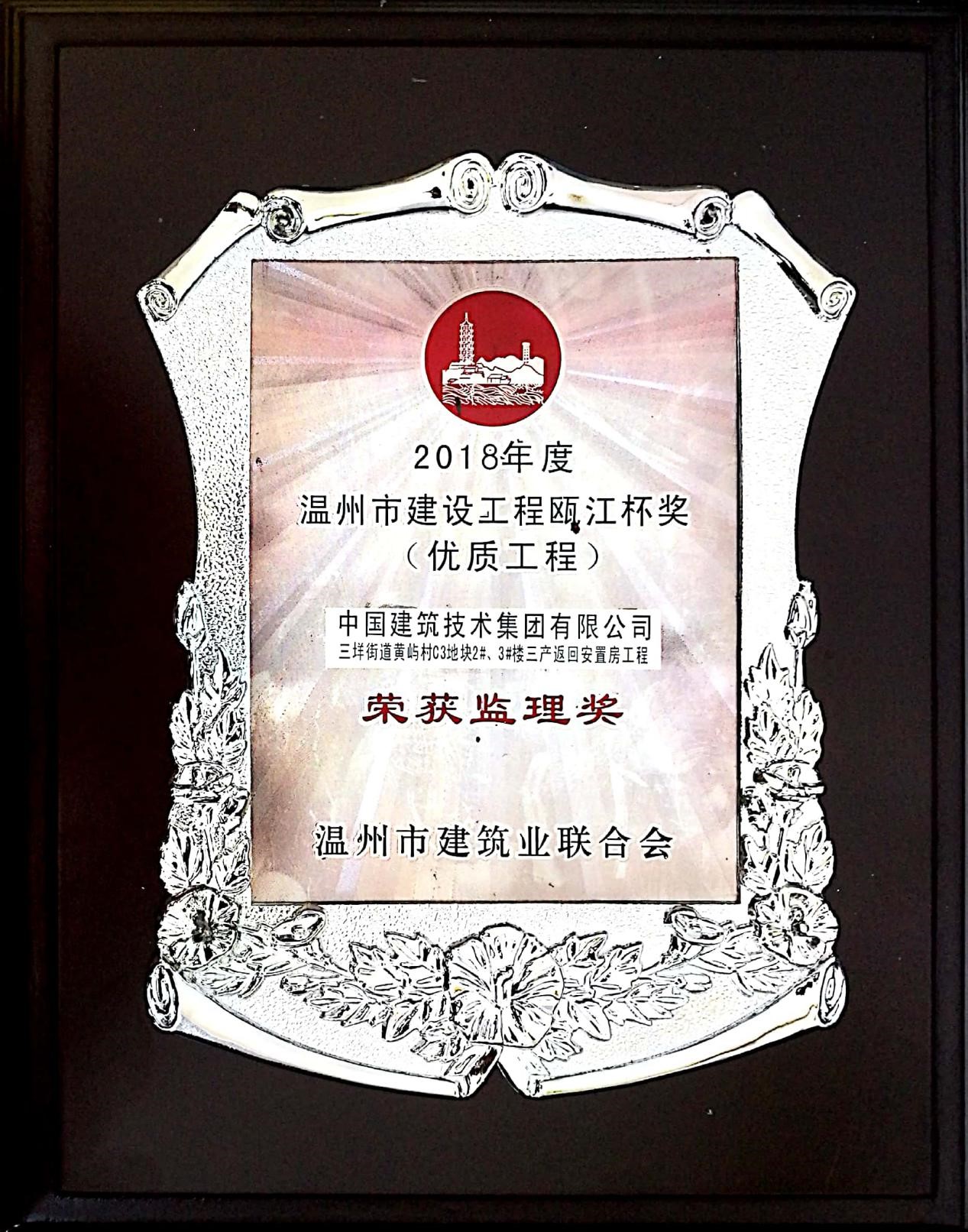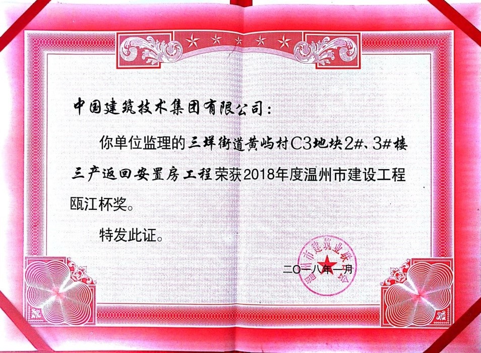 ? ? ? ?近日,溫州住建委、溫州市建筑業(yè)聯(lián)合會召開表彰大會。溫州分公司承攬的“溫州市三垟街道黃嶼村C3地塊2#3#樓三產返回安置房”工程監(jiān)理項目榮獲2018年度溫州市優(yōu)質工程“甌江杯”獎。?
