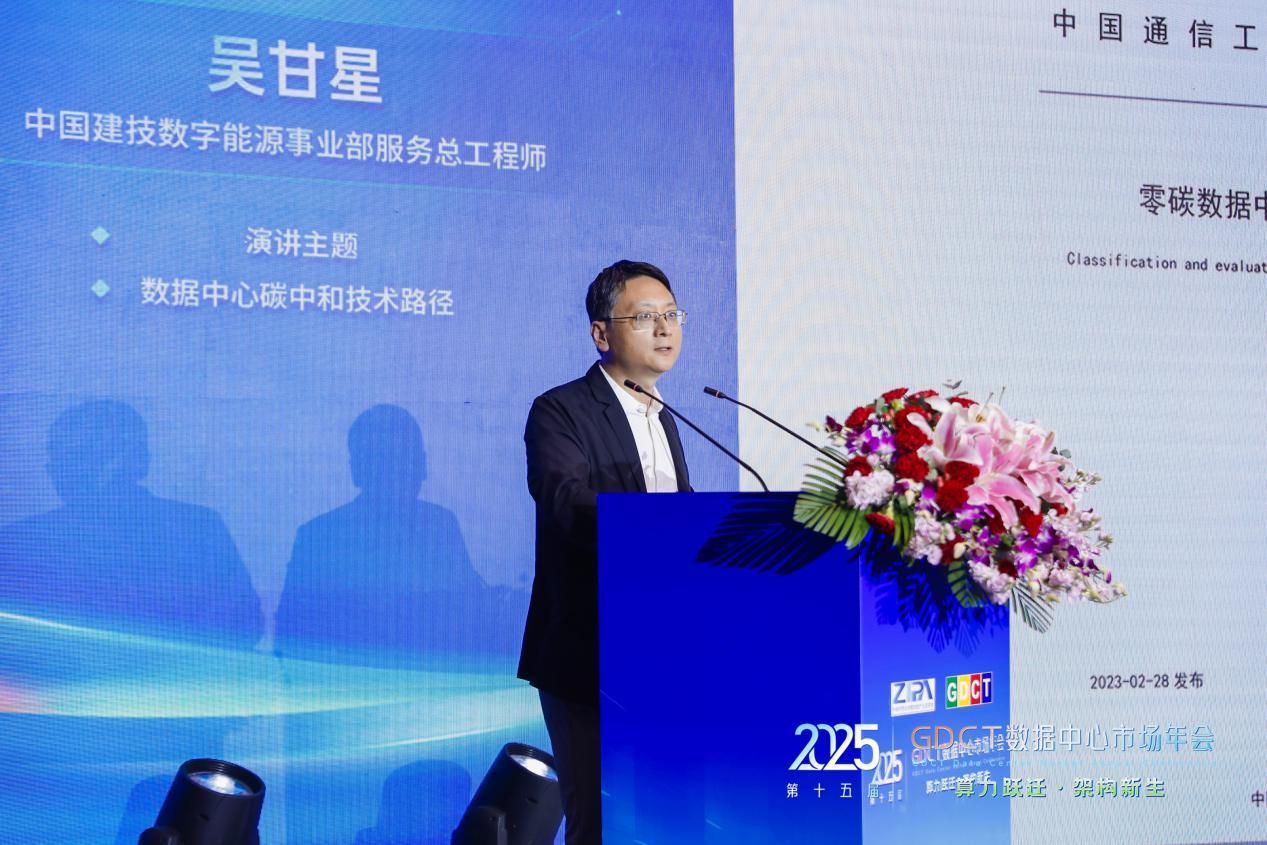 中國建技數(shù)字能源事業(yè)部服務總工程師吳甘星分享了主題為《數(shù)據(jù)中心碳中和技術路徑》的主旨演講,系統(tǒng)闡釋了數(shù)據(jù)中心碳足跡分析方法及碳中和技術路線,提出“能源側(cè)清潔化、用能側(cè)高效化、管理側(cè)智能化”的三角支撐體系,并分享了中國建技在碳中領域的科研創(chuàng)新成果和工程實踐經(jīng)驗。