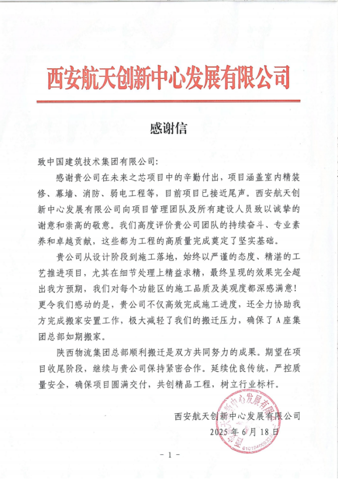 近日,中國建技收到西安航天創(chuàng)新中心發(fā)展有限公司(以下簡稱“西安航發(fā)”)發(fā)來的感謝信。對中國建技在西安“未來之芯”項目團隊展現(xiàn)出的專業(yè)素養(yǎng)、高效協(xié)作以及卓越的項目管理能力給予高度贊揚。