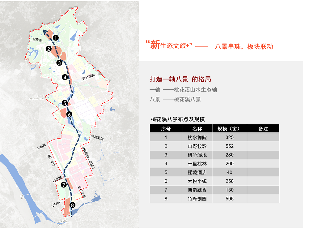 文化景觀打造——結(jié)合開福區(qū)福文化,重構(gòu)桃花溪的生態(tài)系統(tǒng),沿溪以綠道的方式組織內(nèi)部流線,打造桃花溪八景,以景點(diǎn)串聯(lián)功能區(qū),銜接周邊場(chǎng)地互相帶動(dòng),構(gòu)建新型城市都市休閑新空間。