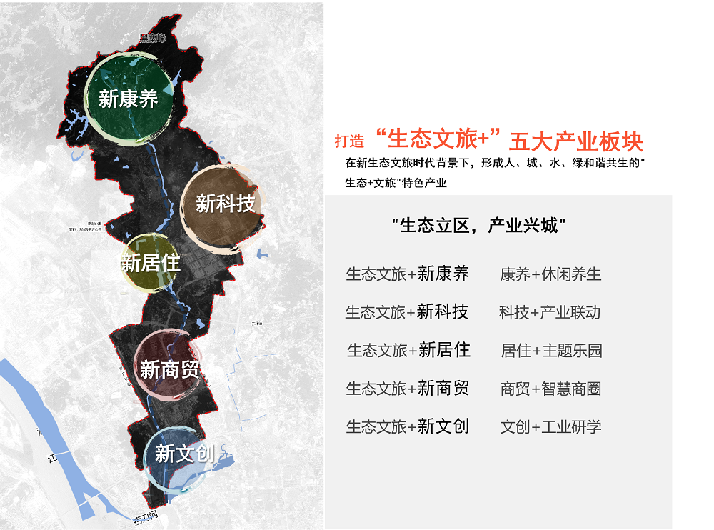3.?產(chǎn)業(yè)布局策劃——在新生態(tài)文旅時(shí)代背景下,形成人、城、水、綠和諧共生的"生態(tài)+文旅"特色產(chǎn)業(yè),打造“生態(tài)文旅+” 五大產(chǎn)業(yè)板塊,即生態(tài)文旅+新康養(yǎng)、生態(tài)文旅+新科技、生態(tài)文旅+新居住、生態(tài)文旅+新商貿(mào)、生態(tài)文旅+新文創(chuàng)。