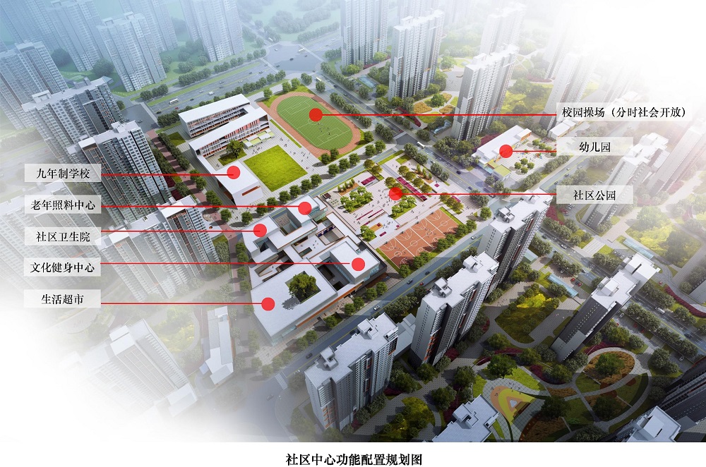 將生活超市、文化娛樂、全民健身、社區(qū)醫(yī)療、老年照料、九年制學(xué)校、社區(qū)公園、幼兒園和管理服務(wù)等社區(qū)類級的公共設(shè)施相對集中或鄰近布局,實(shí)現(xiàn)了便利化使用和規(guī)模化經(jīng)營的雙重目標(biāo)。規(guī)劃同時(shí)兼顧設(shè)施抗擾和共享平衡的問題:醫(yī)療、養(yǎng)老相互結(jié)合,教學(xué)設(shè)施相對獨(dú)立,學(xué)校操場臨近社區(qū)公園和文體中心布置,方便對外開放和聯(lián)動(dòng)使用。