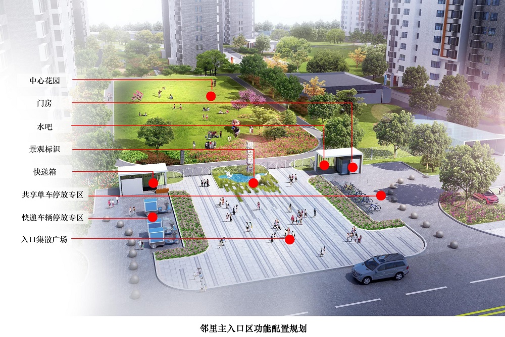 主入口實(shí)行人車分流組織,設(shè)置集散廣場、景觀標(biāo)識和中心花園。精細(xì)化布局門房、快遞箱、水吧、共享單車與快遞車輛停放專區(qū),形成功能強(qiáng)大的新型住區(qū)入口服務(wù)系統(tǒng)。