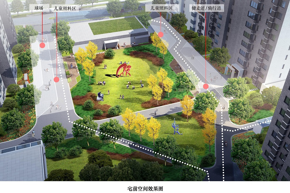利用宅前消防登高場地規(guī)劃打球、健走、騎行和兒童照料等內(nèi)容,將宅前空間作為單元住戶的交往活力場所?;顒?dòng)場地外擴(kuò),結(jié)合綠化布置休閑座椅、花池廊架和文化藝術(shù)裝置,合理布局自行車棚、信報(bào)箱、垃圾收集箱和配電室等項(xiàng)設(shè)施。單元樓門設(shè)置入口標(biāo)識和門禁,居民活動(dòng)也能對樓宇安全發(fā)揮良好的監(jiān)控作用。
