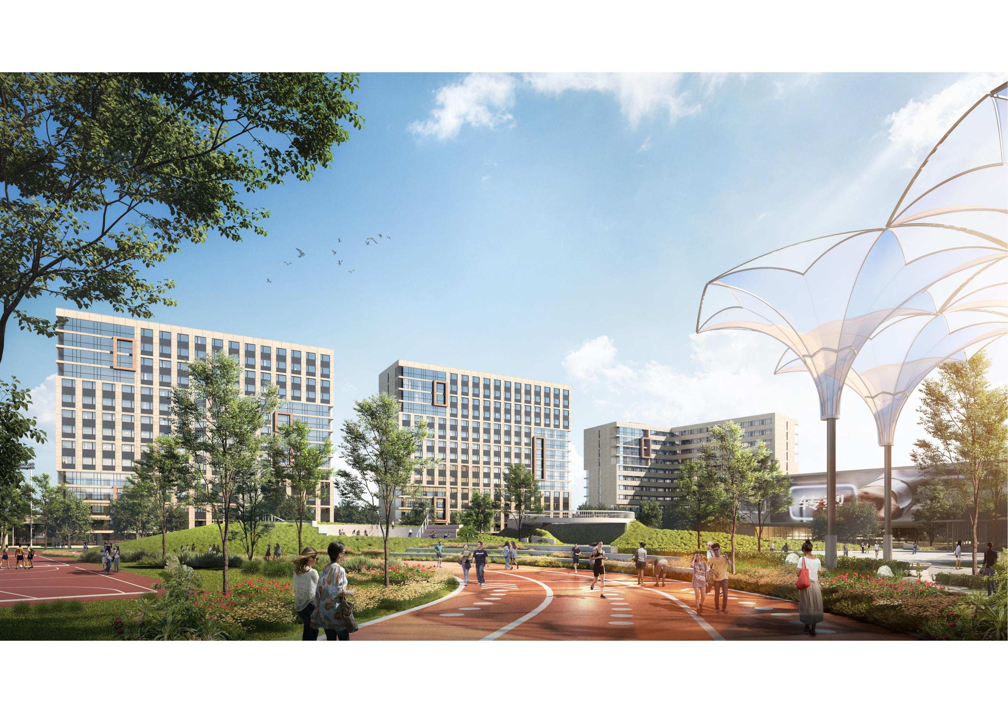 生活區(qū)景觀以“玉如意”為意向,勾勒出學(xué)生活動場地、體育運(yùn)動場地、集會休閑場地等形象,連接?xùn)|西地塊,營造了活潑怡人的生活氛圍。