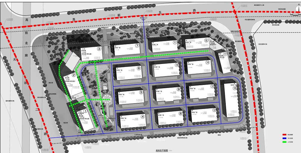 根據(jù)對場地周邊環(huán)境及場地本身的特點(diǎn),結(jié)合高新區(qū)規(guī)劃局的規(guī)劃設(shè)計(jì)要求,本方案分別在光谷二路及高新五路布置主要出入口,結(jié)合中心花園設(shè)計(jì),通過南北、東西方向兩條主要視覺景觀軸線塑造園區(qū)良好的景觀形象。從而打造高檔建筑標(biāo)準(zhǔn),優(yōu)異的環(huán)境品質(zhì)新型高端研發(fā)生產(chǎn)園區(qū)。建筑空間布局北高南低,在高新五路與光谷二路交叉口處設(shè)置兩棟標(biāo)志性25層孵化器研發(fā)大樓。沿高新五路設(shè)置9層研發(fā)車間,基地內(nèi)部建筑層數(shù)高低錯(cuò)落,整個(gè)建筑群天際線變化豐富。