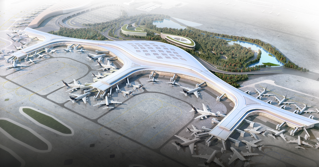 合肥新橋國際機場T2航站樓總建筑面積約36.98萬平方米,采用“雙港灣+雙L”的建筑構型,主樓面寬約400米、進深約180米。南、北兩側指廊寬42米,為國內候機指廊;中指廊寬54米,為國際候機指廊。主體結構為鋼筋混凝土框架,屋頂為大跨度空間鋼結構體系。